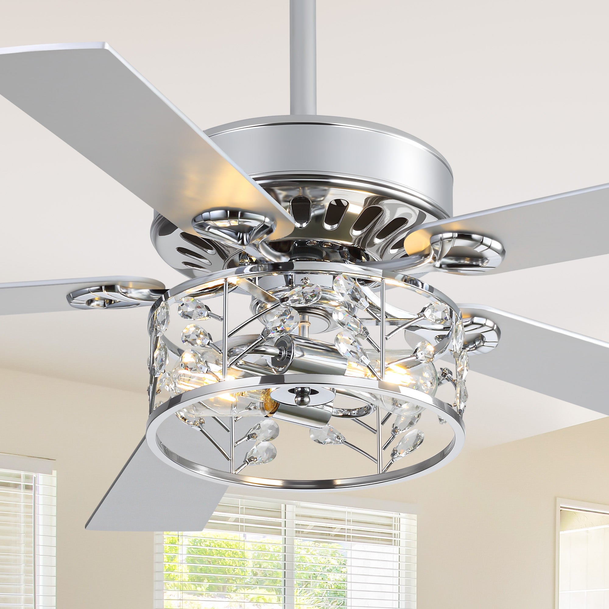 Add elegance and functionality to any room with this stunning 52-inch ceiling fan. Featuring a sleek chrome body, crystal light shade, and dual-tone plywood blades (Silver and Gray Wood Grain), this fan delivers both style and comfort. Equipped with an energy-efficient DC motor, this ceiling fan with light provides six adjustable speed settings, an easy-to-use remote control, and a timer function for ultimate convenience. Whether it’s hot summer days or chilly winter nights, the reversible motor ensures comfort year-round, making it a perfect fit for living rooms, bedrooms, or dining areas.