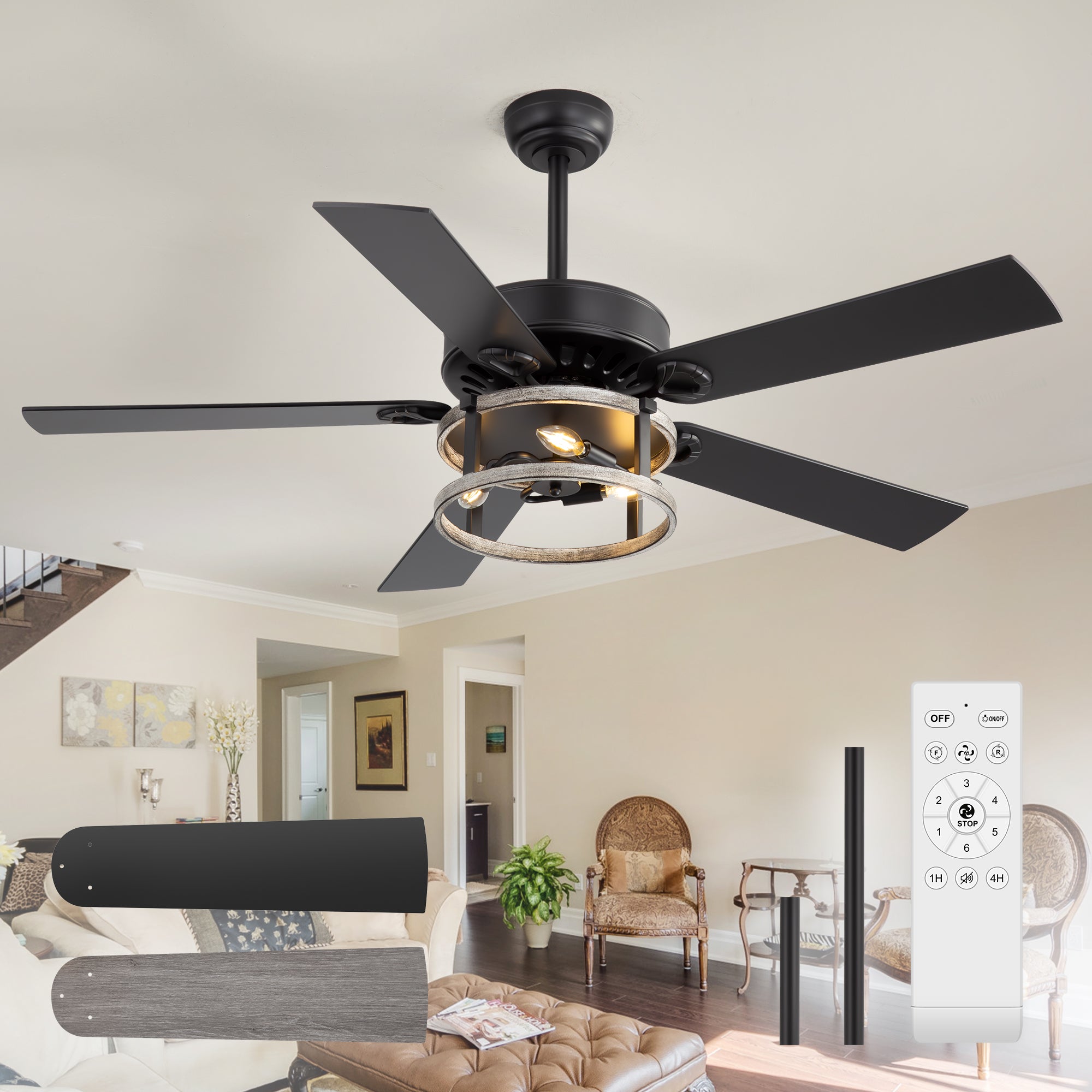 52-Inch Matte Black Industrial Ceiling Fan with Iron Cage Light, 5 Dual-Finish Reversible Plywood Blades, 28W Quiet DC Motor, 6 Speeds, Remote Control, Timer, Reversible Airflow, 5"&10" Downrods