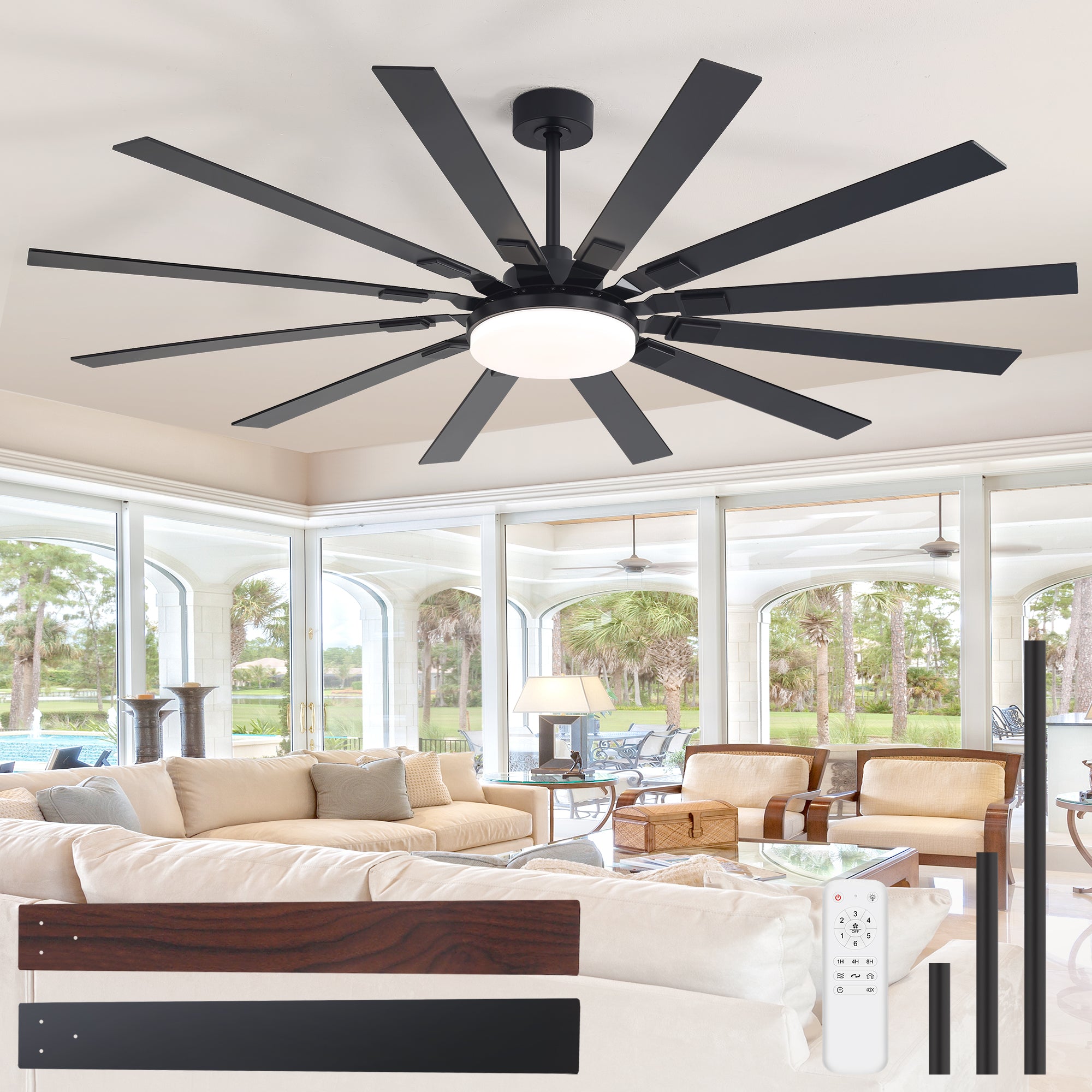 This 72” ceiling fan with light features a dramatic 12-blade design, a quiet and efficient DC motor, and an integrated LED module offering 3000K, 4000K, and 6000K color temperatures with memory function. The dual-finish plywood blades, sleek matte black housing, and included 6”, 12”, and 24” downrods make installation flexible for various ceiling heights. As a modern LED ceiling fan built for large rooms, it provides powerful airflow, reversible seasonal performance, and smooth remote-control operation, bringing comfort and contemporary style to any interior.